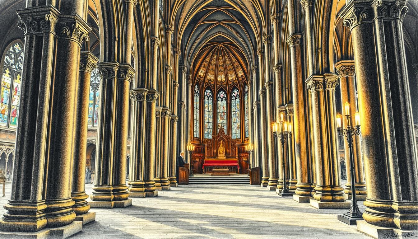 Die majestätischen Gewölbe schienen bis zum Himmel zu reichen. Das Licht fiel durch die berühmten Glasfenster und tauchte den gesamten Raum in ein mystisches Farbenspiel.