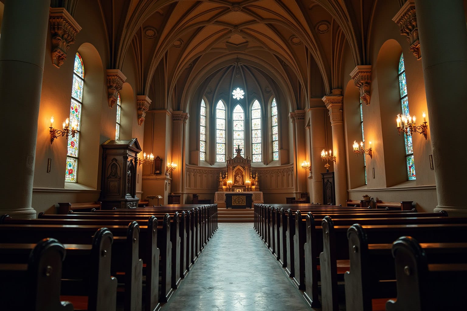 Stimmungsvolle Inneneinrichtung der Altstadtkirche mit Säulen und Altar.